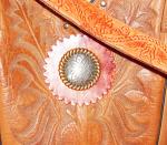 This CC Purse features a 1.5” wide hand-embossed leather strap with a 21" cross-body drop and is finished with beautiful Western conchos on a magnetic closure. This conceal carry handbag is tote-style, without pockets, with a natural boot shaft interior, standing on a flat leather bottom.