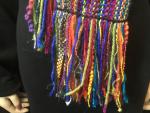 Handwoven mixed fiber scarf in autumn colors — maroon, olive, gold, orange, and yellow with some sparkling fibers.
