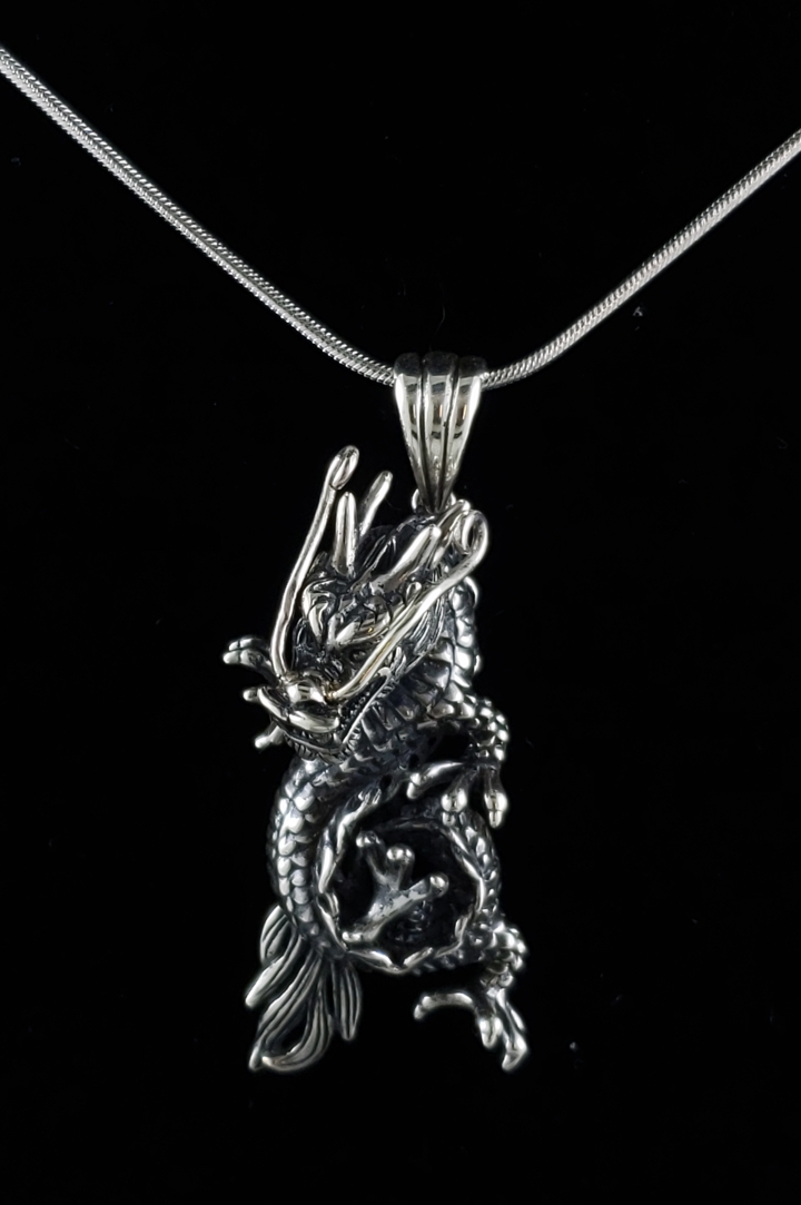 Sterling Silver Hanging Dragon Pendant with 18" Sterling Silver Chain. The detail on this pendant is amazing, it almost seems alive.