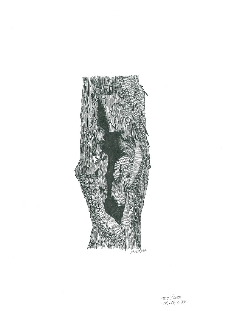 PEN & INK (ORIGINAL 12" X 9") IS IN ARCHIVAL CRYSTAL CLEAR PROTECTIVE PACKAGING. ORIGINAL HAS TWO LAYERS OF FOAM CORE TO PROTECT FROM DAMAGE & IS BOXED READY FOR PICKUP OR DELIVERY. Another decayed Elm tree in Beaver Valley, Ontario was again my inspiration. The contour & wavy line technique was used again to represent bark textures, hollows & heavy ink work for deep shadows & depth. Unfortunately, I didn’t see a Wood Spirit this time.