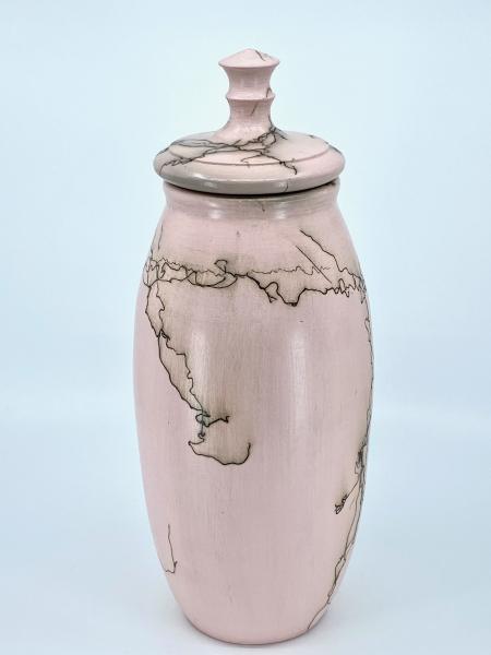 Pink Horse Hair raku fired vessel with lid. ABOUT HORSE HAIR RAKU FIRING: First used by Navajo Native Americans, this firing method uses an outdoor kiln to fire the pieces to approximately 1100 degrees F. Once temperature is reached, the pieces are removed from the kiln and horse hairs are carefully placed on the surfaces. The hairs instantly burn, leaving a carbon print. Due to the extreme temperature fluctuations, hairline fractures in the terra sigillata surface are not uncommon, and add to the uniqueness of each piece. CARE AND USAGE: Because the horsehair firing process does not use traditional glazes, the surface of these pieces are not fully vitrified and are therefore not food or water safe. Please enjoy them for decorative purposes only.