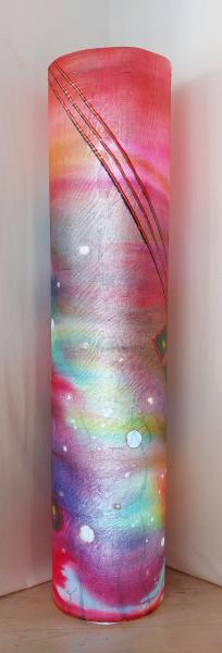 68.5 " x 1" round; no base. Illuminated sculptural paintings that are interactive, changing with every light change and viewer angle, allowing the viewer to personalize my art constantly.