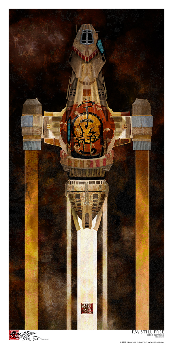 An art print from Nigel Sade. This is a space shuttle based on Firefly. This print is a hand-signed, beautifully vibrant archival quality print. It is a 10x20" standard frame size, easily frameable with frames from Amazon, Michael's Craft store, etc!