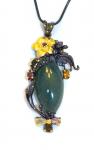 This is one of my newer hand-sculpted pieces. The pendant has a deep green Jade as its centerpiece that measures 18mm by 8mm. The pendant has golden Topaz as accents. The pendant measures 26mm by 38mm. This design also has 22K gold highlights.