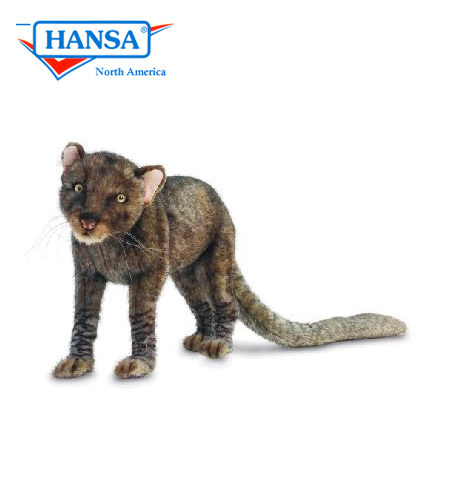The jaguarundi (Herpailurus yagouaroundi); is a wild cat native to the Americas. Its range extends from central Argentina in the south to northern Mexico, through Central and South America east of the Andes. The jaguarundi is a medium-sized cat of slender build. Its coloration is uniform with two color morphs, gray and red. It has an elongated body, with relatively short legs, a small, narrow head, small, round ears, a short snout, and a long tail, resembling mustelids in these respects. It is about twice as large as a domestic cat (Felis catus), reaching nearly 360 mm (14 in) at the shoulder, and weighs 3.5–7 kg (7.7–15.4 lb). From Wikipedia Animal Facts: medium-sized Mexican, Central and South American wild cat: ave length 65 cm (30 inches) w/ 45 cm (20 in) of tail & a weight of about 6 kg (13.2 lbs). Comfortable in trees, but prefers to hunt on the ground. It preys upon fish, small mammals, reptiles and birds. The litter consists of one to four kittens. Details: Length: 20" Width: 8" Height: 12" Position: Standing Age Group: The Recommended age for Hansa animals is 3 and up to comply with ASTM93 safety standards. Portraits in Nature is a hand-crafted collection of realistic plush animals. Artists working in a socially responsible and environmentally responsible studio create each Hansa animal from portraits of the creature in its natural habitat.