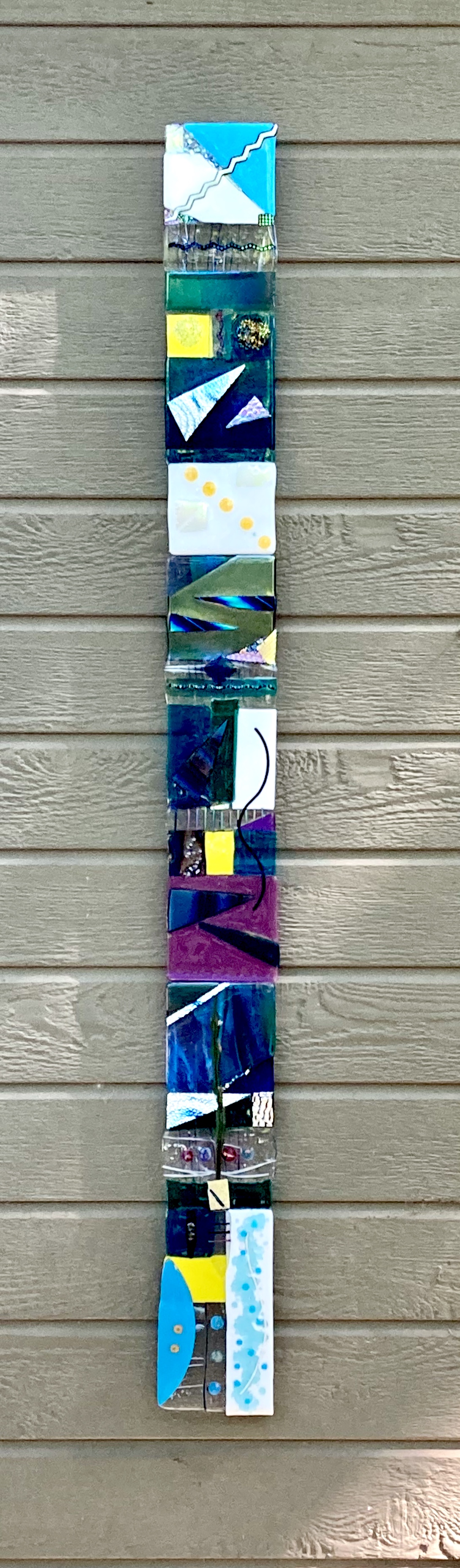 Fused pieces of glass formed to create a one of a kind linear, narrow sculpture to hang vertically. Measurements may not be exact.