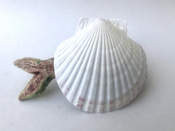 This darling merfrog was hand sculpted, textured with my grandmothers curtain for a scaly look. She was stained with iron oxide, glazed and high fired. After finished she was silicone glued into her own custom sized shell. Each merfrog is unique!