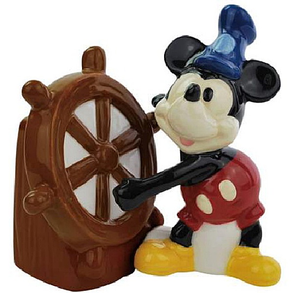 This is a 4" tall set of ceramic salt and pepper shakers in the image of Walt Disney's Mickey Mouse as Steamboat Willie along with the boat wheel from his first appearance in the hit Walt Disney cartoon Steamboat Willie. It is new and unused, held together by embedded magnets and ships in an illustrated box. No longer being made, it has been stored in a smoke and pet free environment.