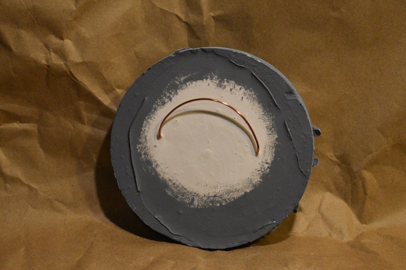 Plaques are first hand-sculpted with clay, molded, and then cast with gypsum cement (AKA plaster of Paris). Once hardened, these plaques take on a stone-like appearance and feel. To achieve the weathered gray stone finish, a layering technique is used with artist-grade acrylic paints. Preserved moss is added using homemade natural water-based glue.
