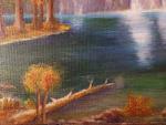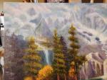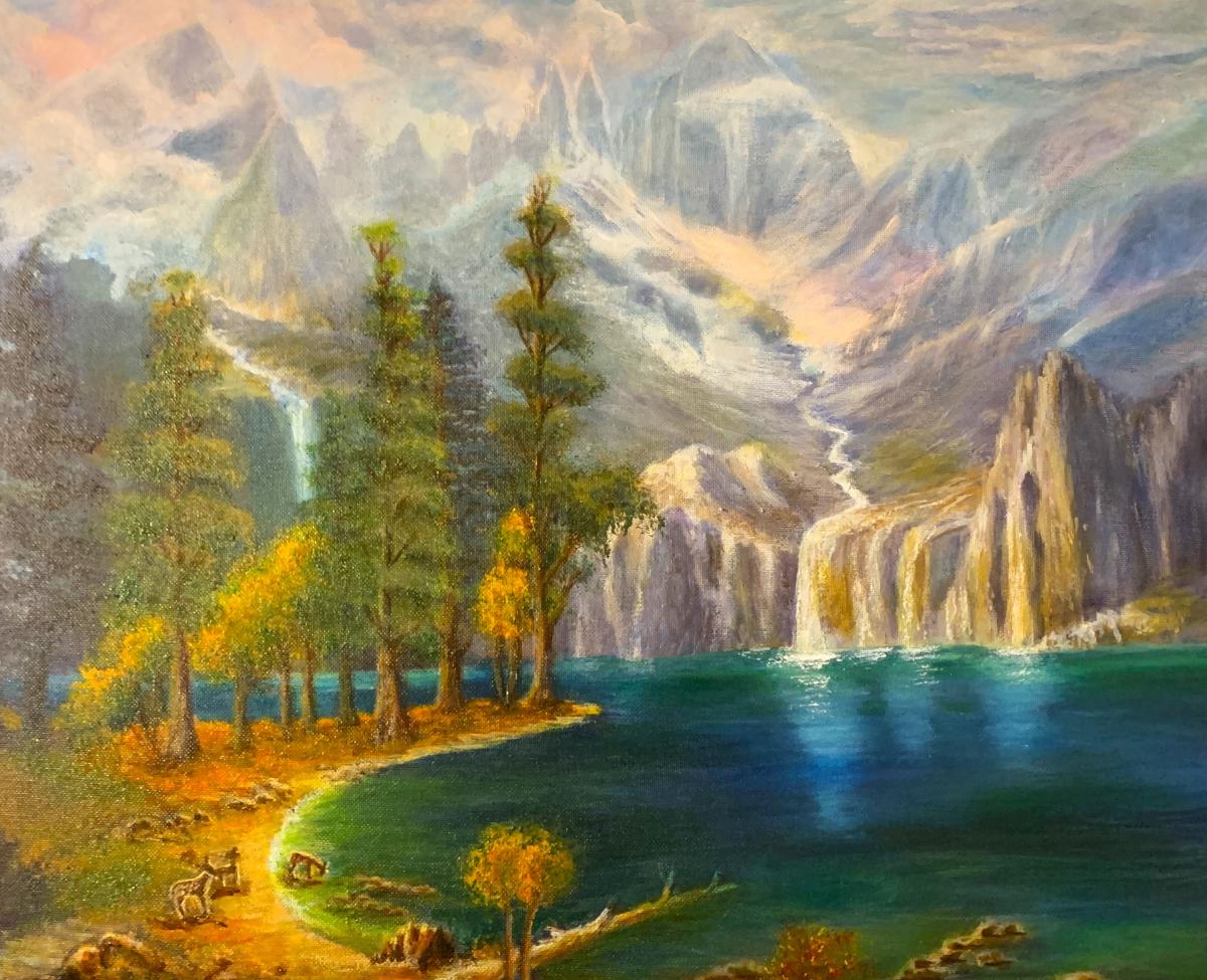 Mystic Mountain Falls showcases a breathtaking scene where towering snow-kissed mountains cascade into glowing waterfalls that feed a tranquil emerald lake. Sunlight breaks through pastel clouds, illuminating tall evergreens and a peaceful forest shoreline dotted with wildlife. Rich textures, atmospheric depth, and vibrant color create a serene escape into untouched nature — a perfect centerpiece for any home or office