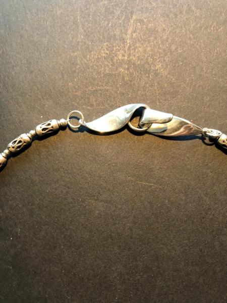 Czech glass red Picasso beads, Silver beads and chain. Sterling silver sculpted clasp. Length 18 in.