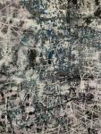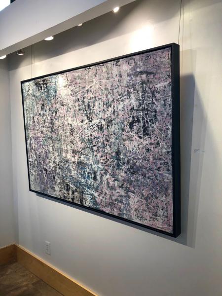 40"x 60" with custom frame. "New Frontiers" series was inspired by NASA's solar system explorations. This series was created after examining surfaces on planets and moons and thinking about the possibility of space tourism, exploration of other planets to search for potential life and space colonization. This painting has a grey and white background with pink, purple, blue, black, white and pale grey lines. It's best viewed in person or via video to appreciate the detail and depth. To see more paintings in this series please visit my website.