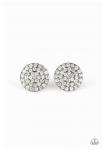 Countless white rhinestones are encrusted across the front of a beveled gunmetal frame for a show-stopping look. Earring attaches to a standard post fitting.