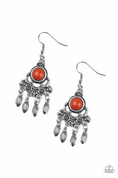 Dotted with earthy orange and gray stone accents, an ornate silver frame gives way to a silver beaded fringe for a seasonal look. Earring attaches to a standard fishhook fitting.