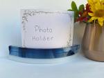 Made of Glass and Shaped like a curve. Insert a photo, a card, your favorite cookie recipe or any piece of paper in the gap between the layers, to create your display. Changing your display is simple and easy. You can even put your pictures back to back to creat a double-side display.