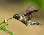 Stunning photograph of a male ruby-throated hummingbird in flight, printed onto 1-mm thick aluminum alloy. The surface has a high-gloss protective finish that increases color brightness and vibrancy. Float-mount hanger included.