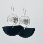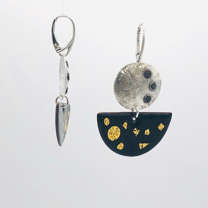 These earrings have had many different techniques and materials come together in its design and creation! The half moon shapes started out as a bare copper sheet metal from which I cut out half moon shapes. These shapes became the base for my vitreous enameling process which you can read more about below if you're interested! I have chosen a deep, dark night sky solid black enamel in this design. Generous accents of 24K gold are incredibly bold and vivid against the black glossy background of the vitreous enamel! The backs are beautifully finished in a solid, glossy black enamel. They dangle beautifully from reticulated sterling silver round domed discs. These also started out as bare sheet metal and from it I have added incredible, deep and rich texture through the reticulation process. Several flat round circle shapes repeat the circle patterns found in the enamel portion of this design. These domed discs were then oxidized with a patina that brings the texture to life! The variety of techniques in this design and this collection overall come together for truly one-of-a-kind pieces of jewelry that you, or perhaps the special person you may be giving it to as a gift, will undoubtedly cherish and love!