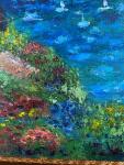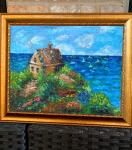 A textured acrylic seascape featuring a charming coastal cottage surrounded by vibrant flowers and overlooking a deep blue ocean. Rich brushstrokes and vivid colors bring warmth and movement to the scene. Beautifully framed in an ornate gold frame and sealed with varnish for lasting protection and shine.