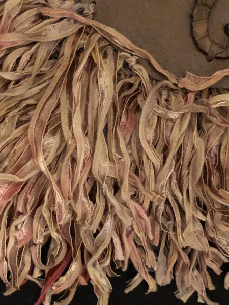 Exterior: leather, dyed ribbon, seahorse, crochet core, zipper top. Crossbody strap