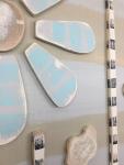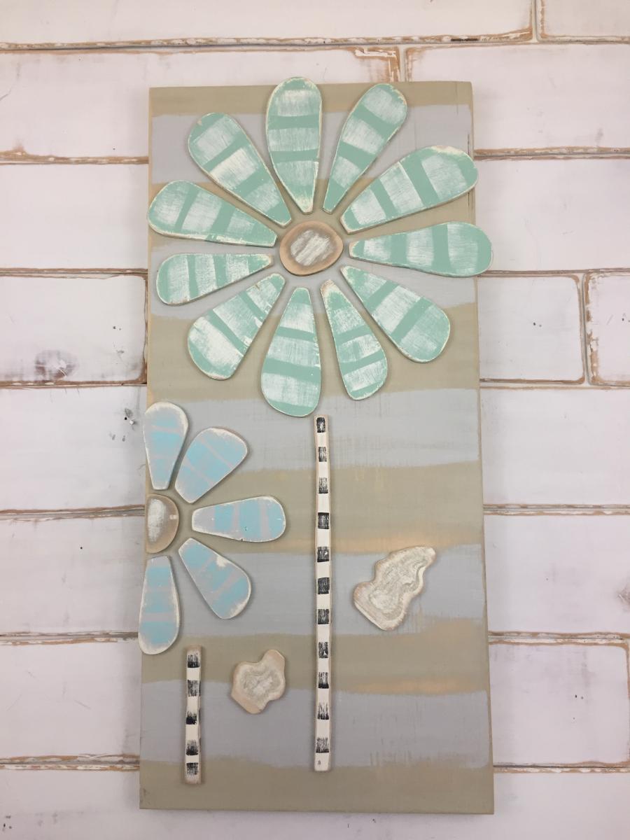 These "seashore" flowers are made of wood hand cut by me on a scroll saw. The colors are muted green, blue and tans. A subtle accent to any room. Measures 12"w x 24"t x 2" d (approximately). This piece comes signed and wrapped in kraft paper and jute.