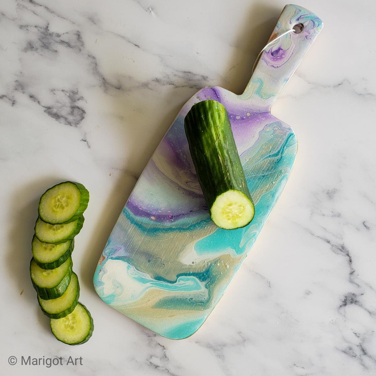 SERENITY One side is decorated with poured paint and coated with a food safe resin to protect the artwork. The other side is solid bamboo, perfect for slicing, dicing and chopping. There is a small loop in the handle for easy hanging. Colors are purple, white,silver, turquoise and glitter