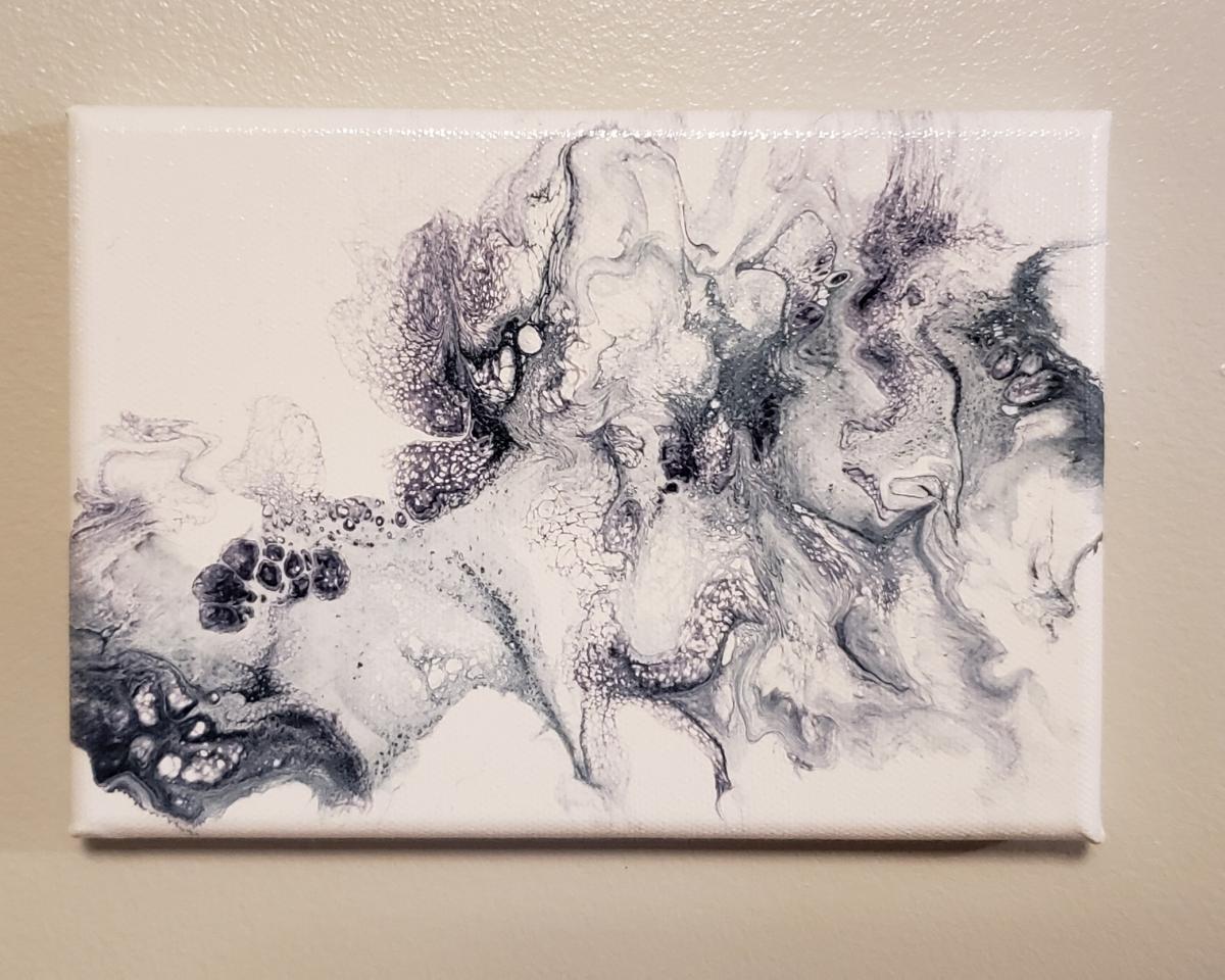 This is an acrylic pour on a 5"x7" canvas Colors: titanium white, silver, pewter, Payne's grey