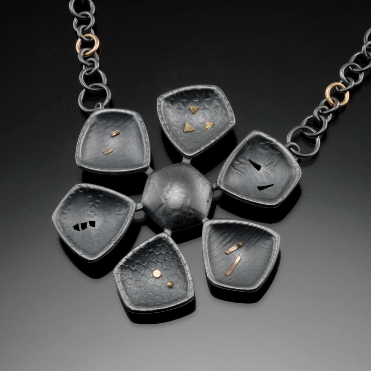This handcrafted, one of a kind pendant was inspired when I saw some close up images of snowflakes. I found them so fascinating that I attempted to recreate one in metal. It’s constructed of oxidized sterling silver with 18k gold accents and features delicate piercing. A portion of the chain is also handmade of sterling and 18k gold . The pendant measures 2 1/8” x 2 1/8” x 1/4”. The chain is 24” long with a 4” extension and can also be shortened by clasping on any link of the chain.