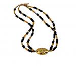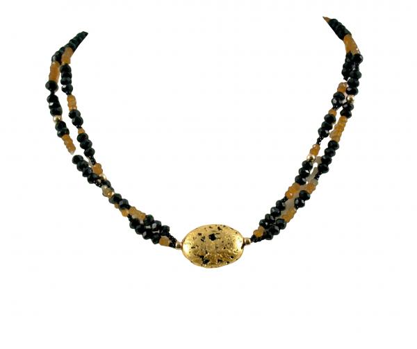 "Sparkles" Necklace Ah, the elegance of black and gold! A stunning combination of sparkly black spinel and golden hessonite with my signature 23-Karat gold leaf gilded centerpiece lava stone. There are two strands of the mixture of spinel, hessonite (a yellowish brown garnet) and round 14-Karat gold-filled beads. I have finished the necklace with a 14-Karat gold-filled toggle clasp along with my signature tag. The necklace measures 17". You Might Also Like: See More Here: https://www.eventeny.com/company/?c=10128