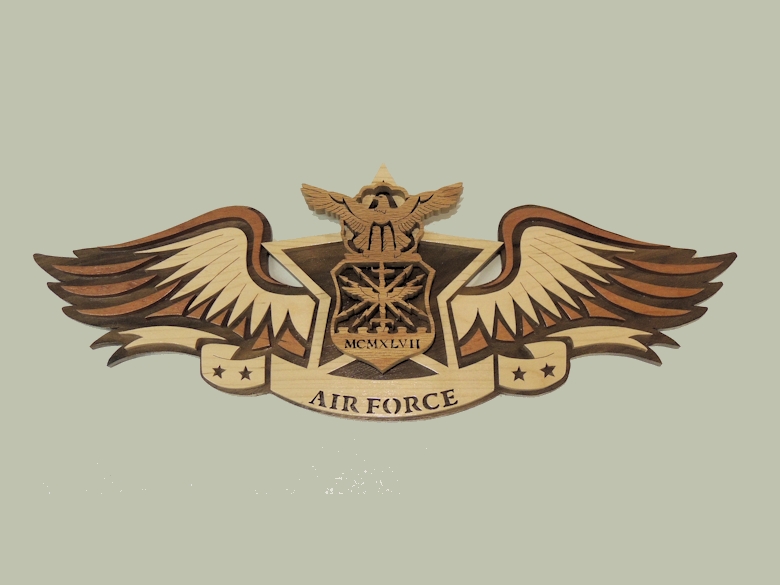 This cutting, from the Special Wings Section, features the United States Air Force. By using different species of wood, I am able to color enhance this plaque. The plaque measures almost 17" wide and 7" tall. A perfect addition to the soldiers's wall who already has everything. Common woods used: Background is Walnut - Wing is Aromatic Cedar, Maple and Walnut - Emblem is Red Oak.