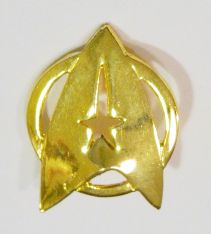 This is a gold toned metal enamel pin in the shape of the Star Trek command logo as seen in Star Trek: The Motion Picture. It measures 1.375" high and is in mint, unworn condition. Produced by Lincoln Enterprise (the late Majel Roddenberry's company), it has had limited release and is not easily found outside of Star Trek conventions. It has been stored in a smoke and pet free environment.