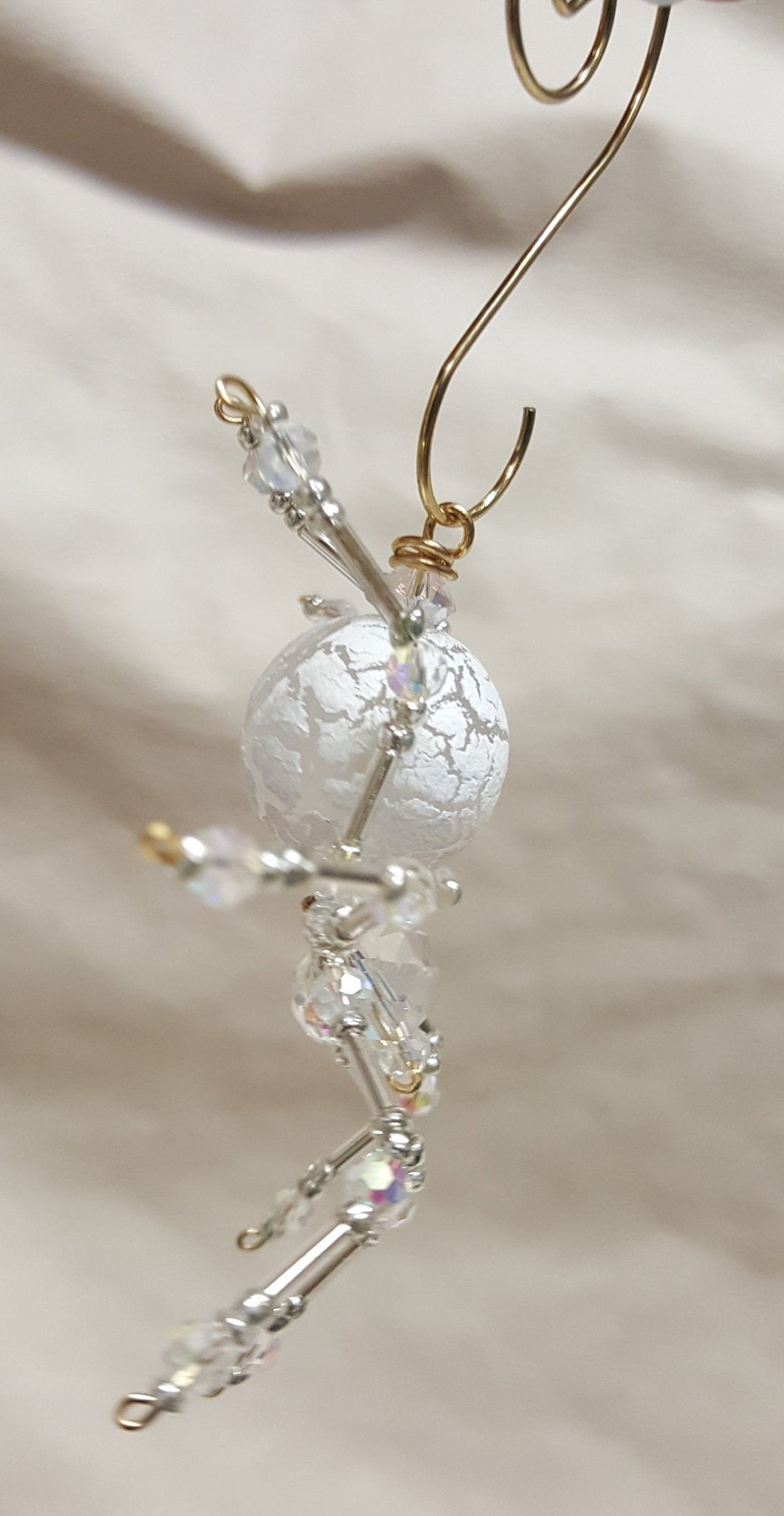 This is a handmade beaded crystalline snow spider. The abdominal area is made from a larger plastic frosted bead with a small faceted clear bead for the head. The legs are made from flexible but sturdy 21 ga. wire which are covered with small silver Swarovski Glass and white plastic beads and can be carefully adjusted to almost any position. A gold decorative hook is attached to the back of the abdomen and can be used to hang the spider or be removed.