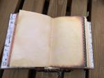 This journal measures 9"x6.25" it has a hand painted cover and a raised textured clock motif on the front cover and a fabric spine covering. Inside there are 5 hand stitched signatures for a total of 200 front and back pages. The papers are a combination of printed paper and hand dyed tea, coffee and avocado dyed paper. There are accents of lace and trim, tuck pockets, and other embellishments. The center of each signature of pages has been tied off and small charms are attached to the strings. This has all been put together by hand and is one of a kind.