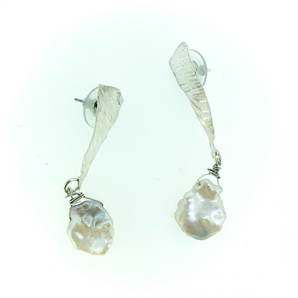 Sterling silver post earrings with a hanging .5-inch diameter coin-shaped freshwater pearl created with low-tarnish sterling silver. 2.1-inch length