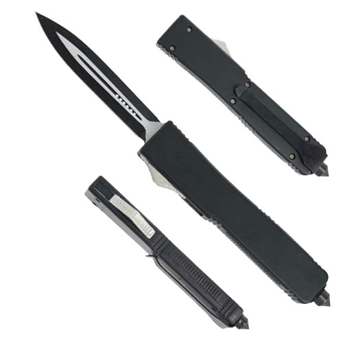 This Glass Breaker style OTF is the perfect tool for any emergency exits in your car or a great self defense tools. It sports a black and silver sharp spear point double edge blade with a strip of silver and six air holes in the middle with blood grooves on both sides. This particular OTF Glass Breaker Knife is fully automatic. Just push on the metal button on the spine of the handle and watch this blade in action. Just push the button backward to retract the blade into the handle. The handle features an all black steel finish with six hex screws and finger grips on the spine. It also sports a black pocket clip for easy access when using. The top of the handle also features the glass breaker for emergency get a ways or self defense when the need arise. This knife is an eye catcher and a must have for any OTF enthusiasts or knife collectors. Overall Length: 8.5 inch