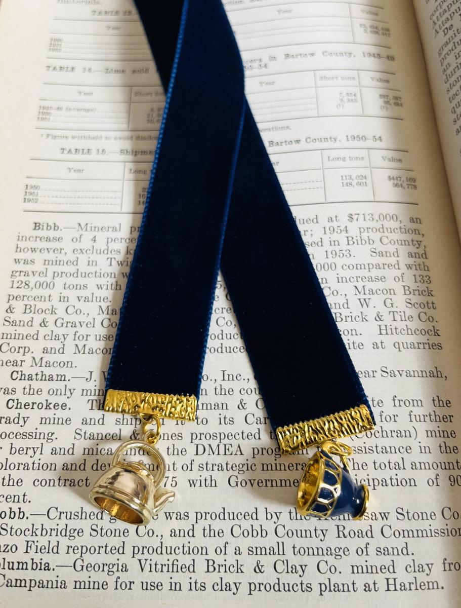 Beautiful navy or black Swiss velvet ribbon bookmark with navy & gold tone or black & gold tone enamel teacup charm and brass teapot pendant. Ribbon is approximately 12-14" long, not included charms/pendants.