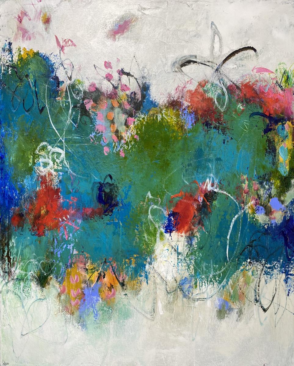 I paint intuitively, letting layers of paint, fabric and paper interact and unfold into a story. When I discover the story within the painting, its meaning comes into focus. When the meaning has been revealed, my painting is complete.