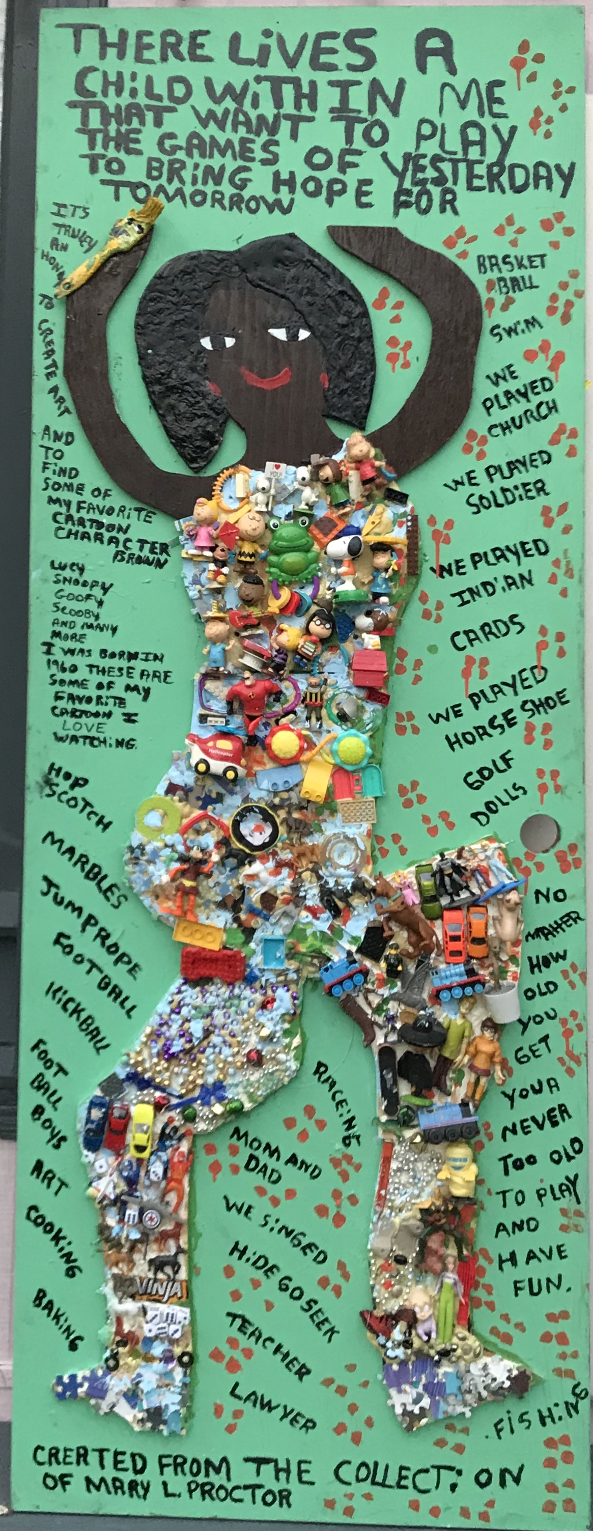 This door is made with a wood cut out and an assortment of toys and trinkets with inspirational words of the Games of yesterday to bring Hope For Tomorrow.