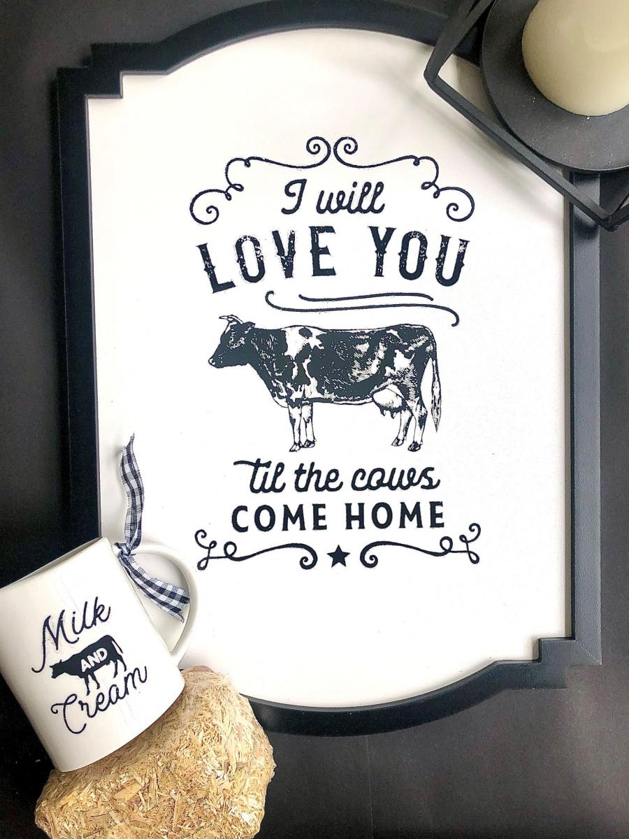 I Will Love You Til the Cows Come Home chalk painted in black velvet chalk paste on a beautiful black and white board. Board measures 11.75" W X 16.25" H and has alligator hooks for easy hanging.