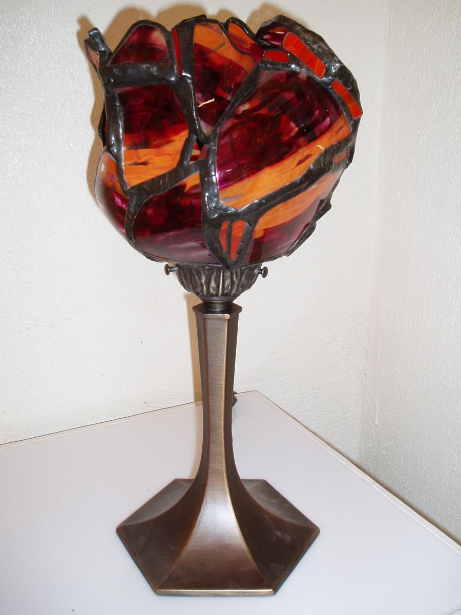 Beautiful fuschia glass with some orange sections and some clear areas, gives off wonderful shadows and is a great mood light for any room. Blown glass with glass globs, copper foil technique, lamp top separates from the base for shipping.