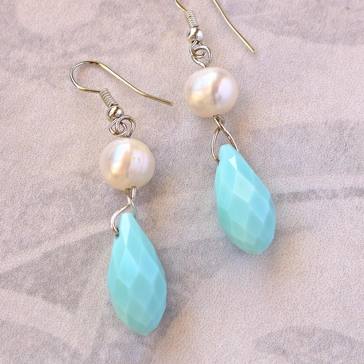 Turquoise blue facet quartz with freshwater white pearl earring