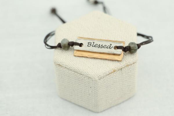 Need a word of inspiration... This beautiful two tone bracelet will go with any look. Bronze, layered with pewter and accented on either side with labradorite stones. The cord is a strong polyester cord that can be worn in the shower or slept in. Choose from faith, hope, grace, loved, breathe, be still, strong, dance, laugh, joy, but God, shine, blessed