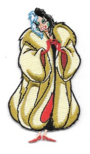 This is a 4" high mint, embroidered patch which features the standing figure of Cruella De Vil from the classic Disney animated film 101 Dalmations. It has a glue backing for easy application to hats, shirts, jackets and bags and is stored in a smoke and pet free environment.