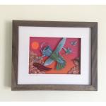 Some flowers need thirst-quenching assistance from a rarity of the bird kingdom. This piece is a one of a kind reproduction of original art that is a mixed media concoction of hand painted elements, collage, giclee printed material cut by hand and assembled lovingly in a mat and 9 x 11 inch frame. Ready to hang upon arrival.