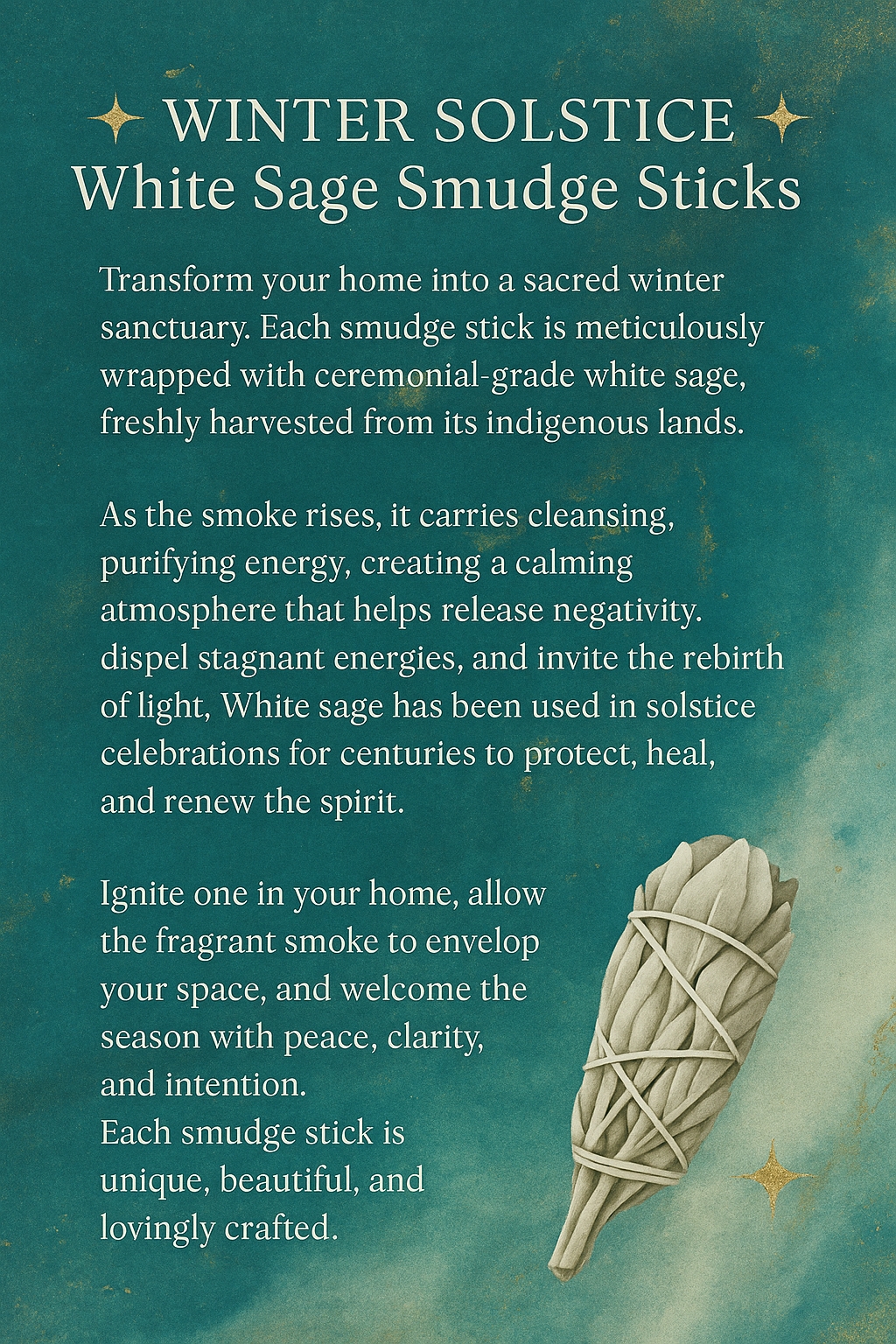 White Sage smudge sticks are traditionally used to cleanse negative energy, promote clarity, and create a peaceful, sacred space. When burned, the fragrant smoke helps purify the mind, body, and environment, inviting renewal and grounding during the winter season. Each smudge stick is hand-wrapped with intention, offering a beautiful way to refresh your home and spirit.