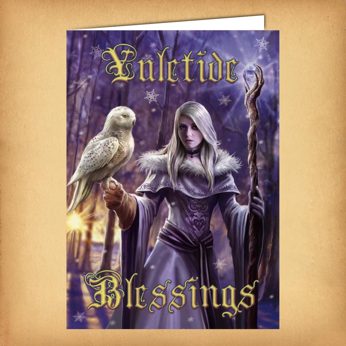 • Single card & coordinating envelope • Holiday message inside • Shadow artwork inside You can feel the hush of the forest as dawn breaks on the Winter Solstice. The long night is over, and new light spreads across the land. The Winter Owl Yule Card by Anne Stokes captures that moment of transformation — when the Wheel of the Year turns, and magic feels close enough to touch. A young witch stands among the snow-covered trees, her owl companion calm and watchful at her side. Together they greet the returning sun, their breath mingling in the chill morning air. It’s a fantasy greeting card that feels both powerful and serene — a reminder that light always returns, and every ending carries the promise of a new beginning. Inside, you’ll find more of Anne Stokes’ enchanting artwork — a robed maiden and her owl beneath softly falling snow. The facing page reads, “With blessings of the season,” leaving space for your own Yuletide message. The Winter Owl Yule Card measures 6 ¾″ × 4 ¾″. It includes a single card and coordinating envelope, cellophane-wrapped for protection. It also fits perfectly in a standard 5″ × 7″ frame, making it easy to keep and display as a small piece of seasonal art.