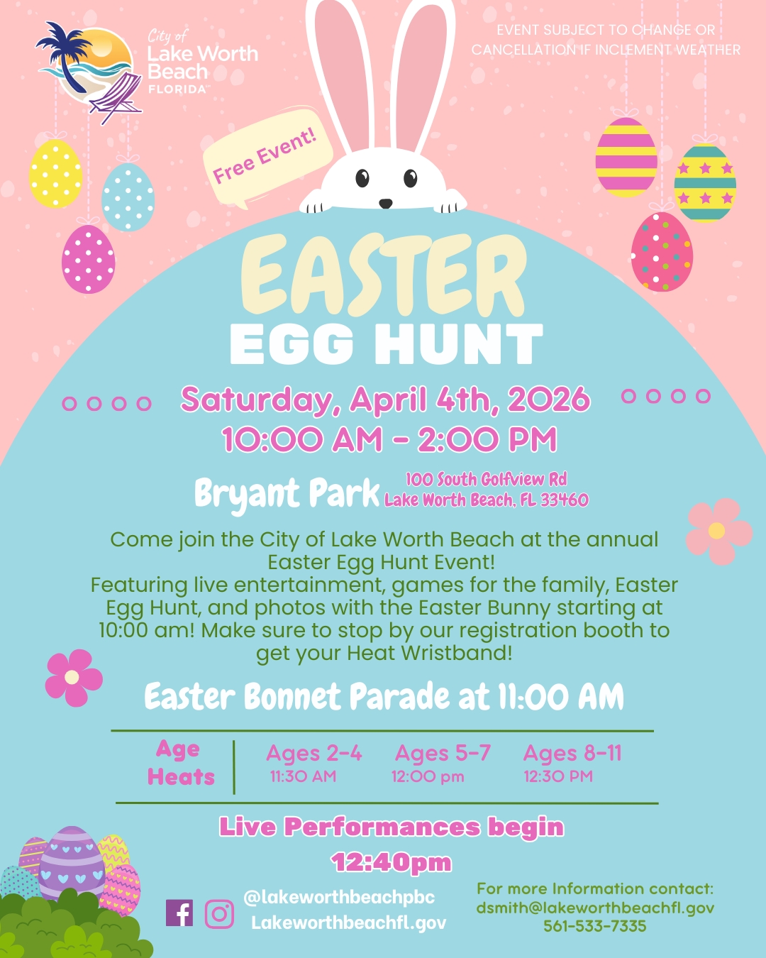 Join the City of Lake Worth Beach in their annual Easter Egg Hunt Event on Saturday, April 4th, 2026 from 10:00 am - 2:00 pm.