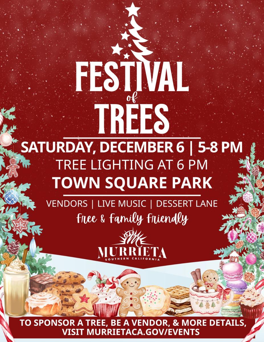 Join us for this year's Festival of Trees & Tree Lighting, where your business can shine both at the event and throughout the holiday season! This application is for non-food vendors who wish to participate at the event and sponsor a decorated tree. Your decorated tree will be featured during the Festival and can either bring joy to a local family or become part of the Holiday Tree Trail, a collaboration with the Murrieta/Wildomar Chamber’s Shop Small this Season campaign — keeping the holiday magic alive in your business all season long!