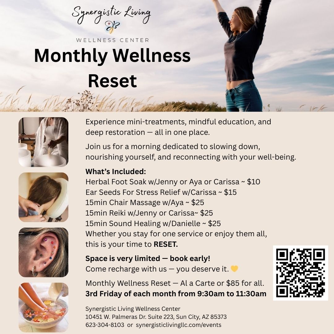 Experience Mini-Treatments, mindful education, and deep restoration - all in one place. Slow down, nourish yourself, and reconnect. Experience mini-treatments, mindful education, and deep restoration - all in one place. Join us for a morning dedicated to slowing down, mourishing yourself, and reconnecting with your well-being. What's Included (A La Carte Menu): Herbal Foot Soak ~ $10 Ear Seeds for Stress Relief ~ $15 15min Chair Massage ~ $25 15min Reiki Session ~ $25 15min Sound Healing Session ~ $25 Whether you stay for one service or enjoy all, this is your time to RESET. Space is limited ~ Book Early! Come recharge with us - you deserve it! Monthly Wellness Reset - Third Monday of Each Month from 9:30am to 11:30am.