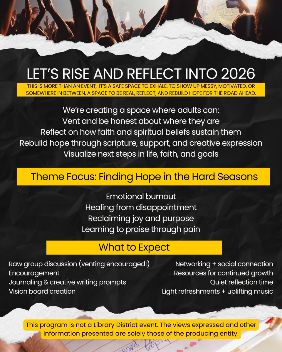 Unfiltered Hope is a faith-centered afternoon gathering designed to help adults reflect, rebuild, and reignite their hope as they move into 2026. Through honest conversation, creative expression, and scripture-based encouragement, this event provides a safe and welcoming space for people to vent, process, and find renewal.